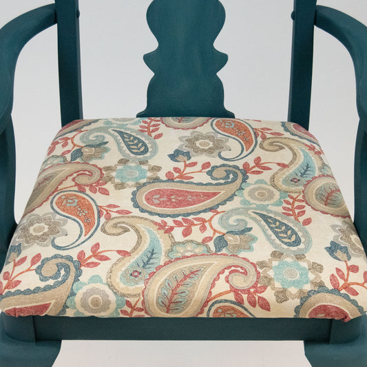 Refurbished Vintage Antebellum Accent Chair – Teal Blue with Paisley Upholstered Seat
