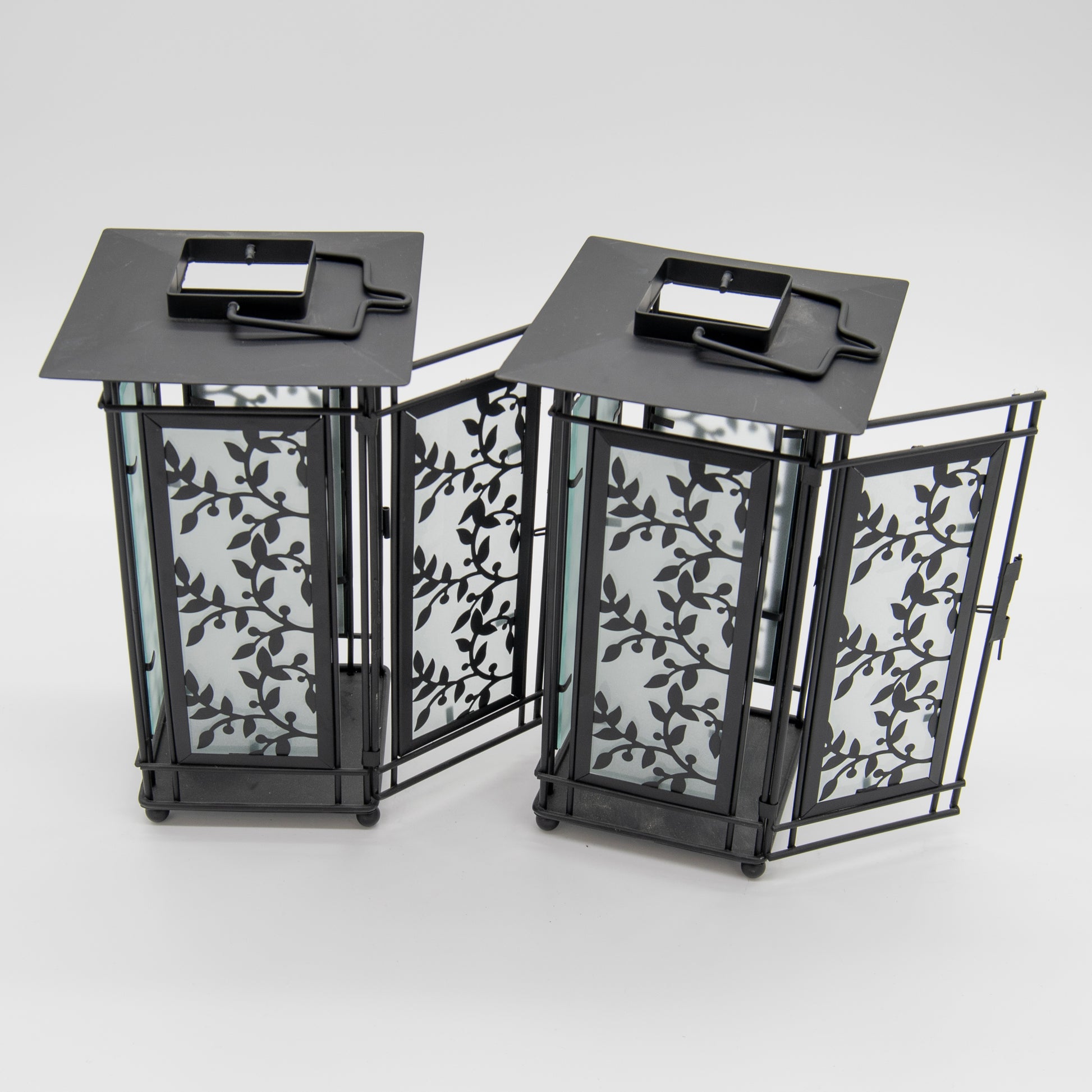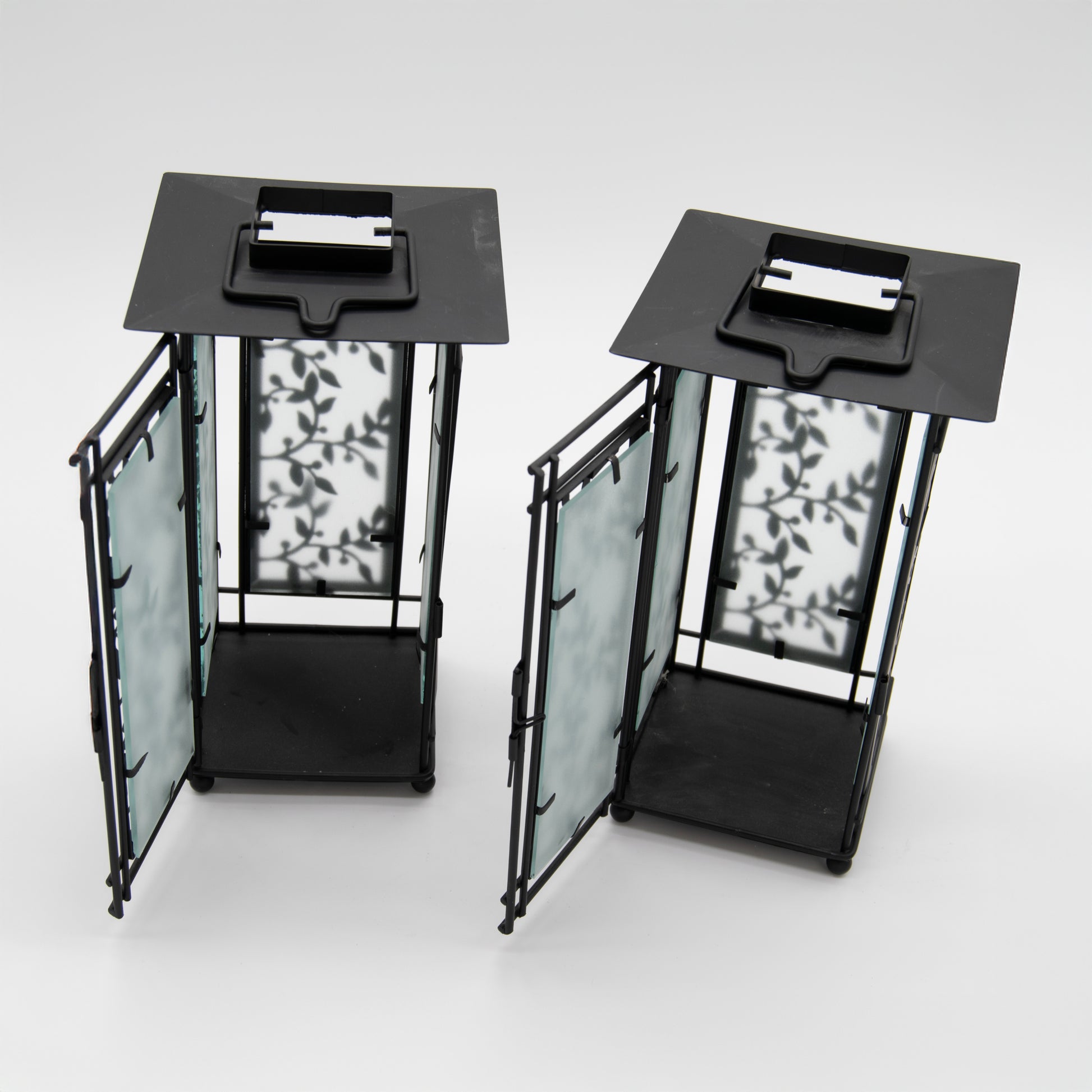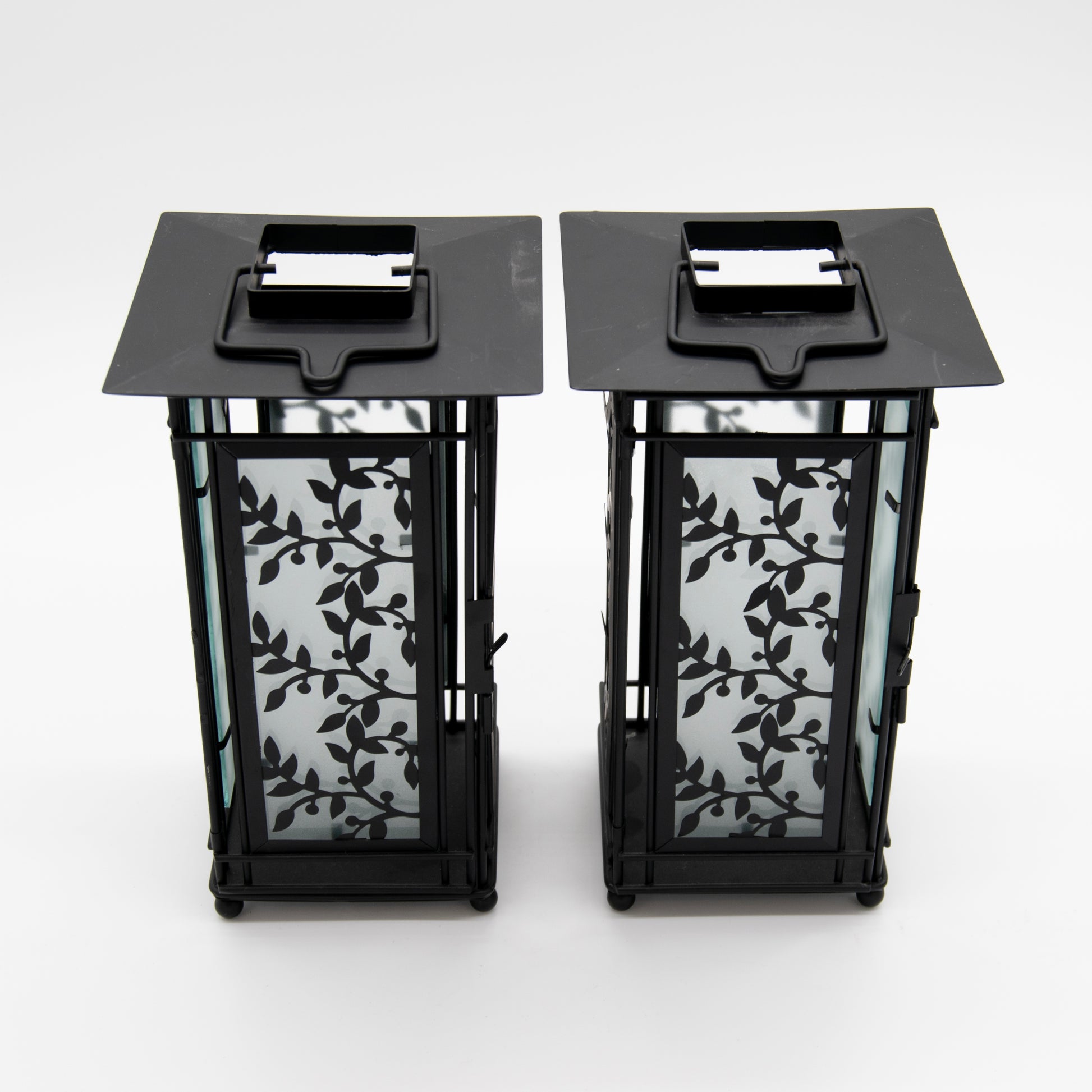 Create a warm and inviting atmosphere with this set of two black metal lanterns, featuring frosted glass panels with a delicate vine pattern. These elegant indoor and outdoor lanterns are designed with hinged doors for easy candle placement, making them perfect for tea lights, votive candles, or LED lights. The sleek black metal frame and soft frosted glass combine for a modern yet timeless aesthetic, ideal for home decor, patio lighting, weddings, or special events.