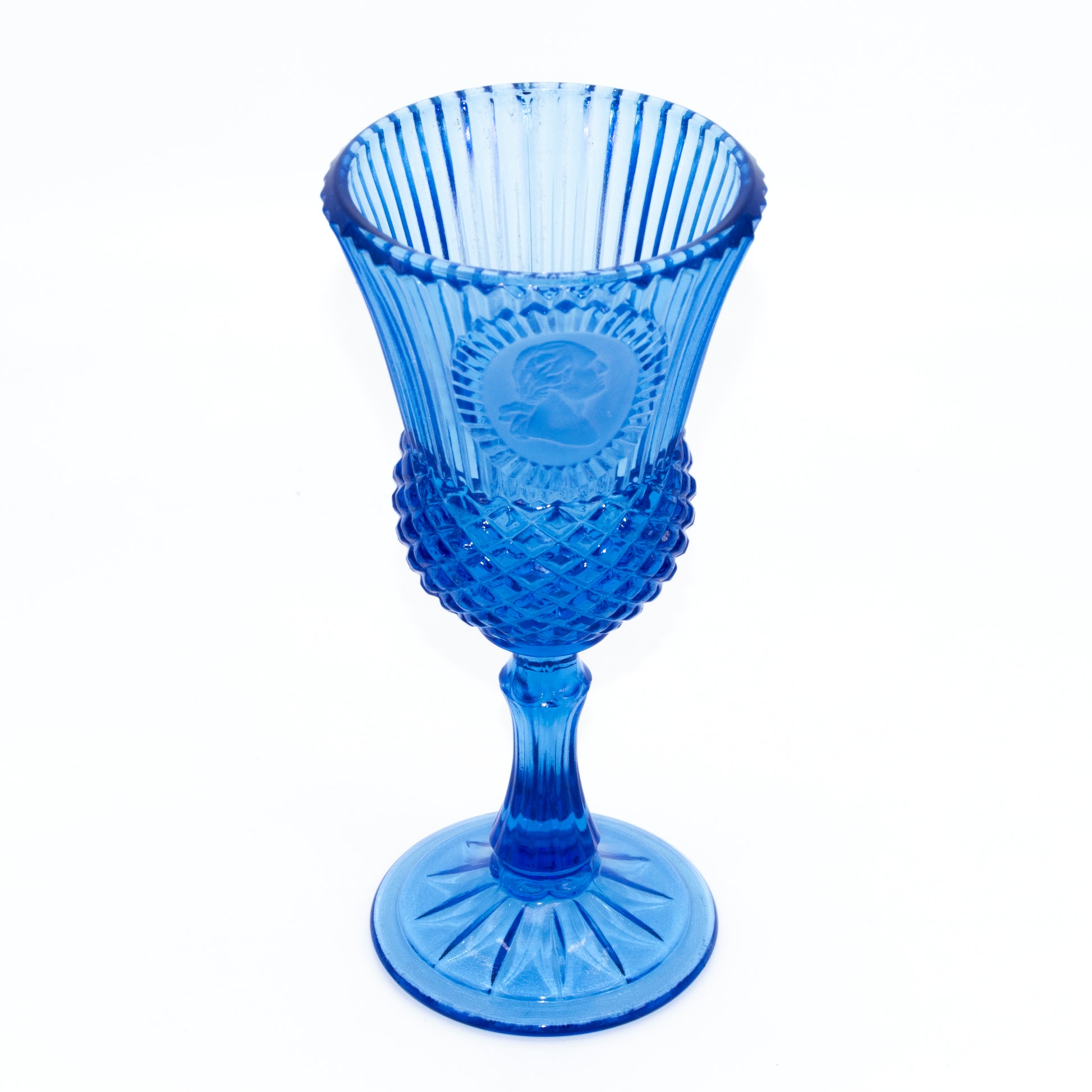 Add a touch of vintage elegance to your collection with this Fostoria for Avon Blue Glass Goblet. Crafted with stunning detail, this collectible glass features a rich sapphire blue hue, intricate diamond-cut texture, and a raised cameo profile that captures timeless sophistication.