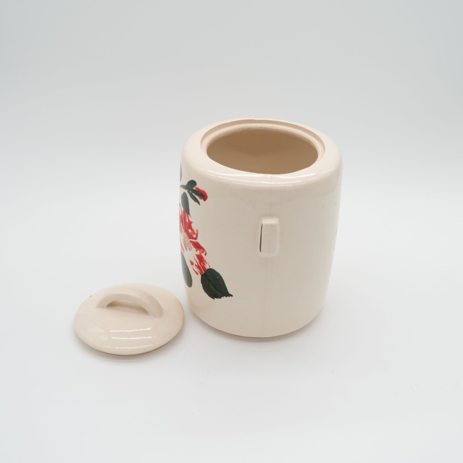 Bring timeless charm to your kitchen with this vintage McCoy cookie jar. Featuring McCoy’s signature craftsmanship, this collectible ceramic cookie jar is beautifully hand-painted with a bold red floral motif and deep green leaves on a classic cream glaze. It’s an ideal statement piece for vintage decor lovers and collectors of retro kitchenware.