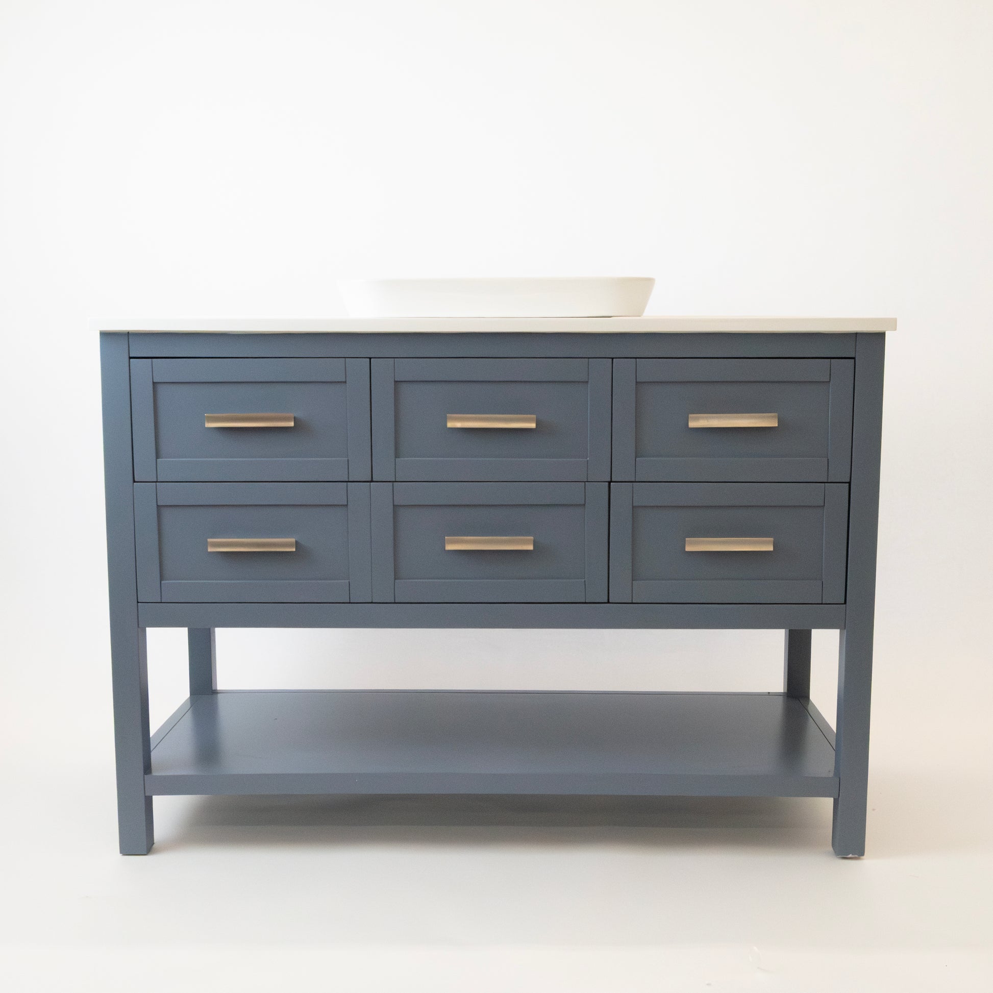 Upgrade your space with this steel blue 48-inch vanity with sink, combining ample storage, sleek design, and lasting durability for the perfect bathroom centerpiece.