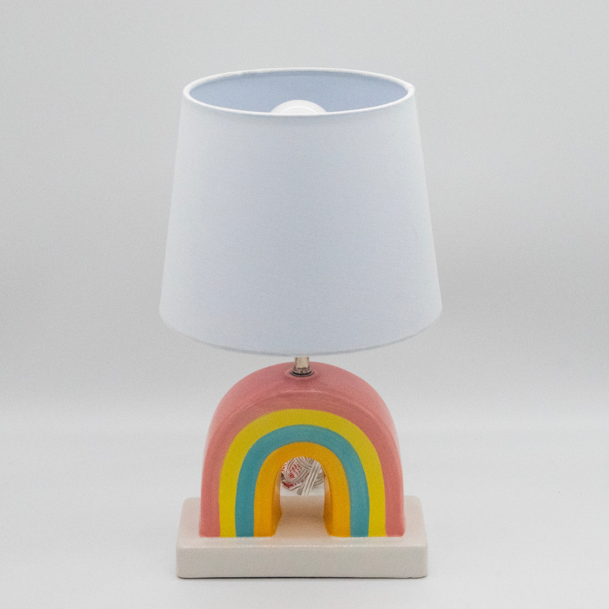 Brighten up your child’s bedroom or playroom with this New Kids Rainbow Table Lamp. Featuring a fun rainbow base with vibrant pink, yellow, and blue arches topped with a crisp white shade, this lamp adds a cheerful pop of color to any space. The compact size makes it perfect for nightstands, desks, or side tables, providing a soft and cozy glow for bedtime reading or playtime.