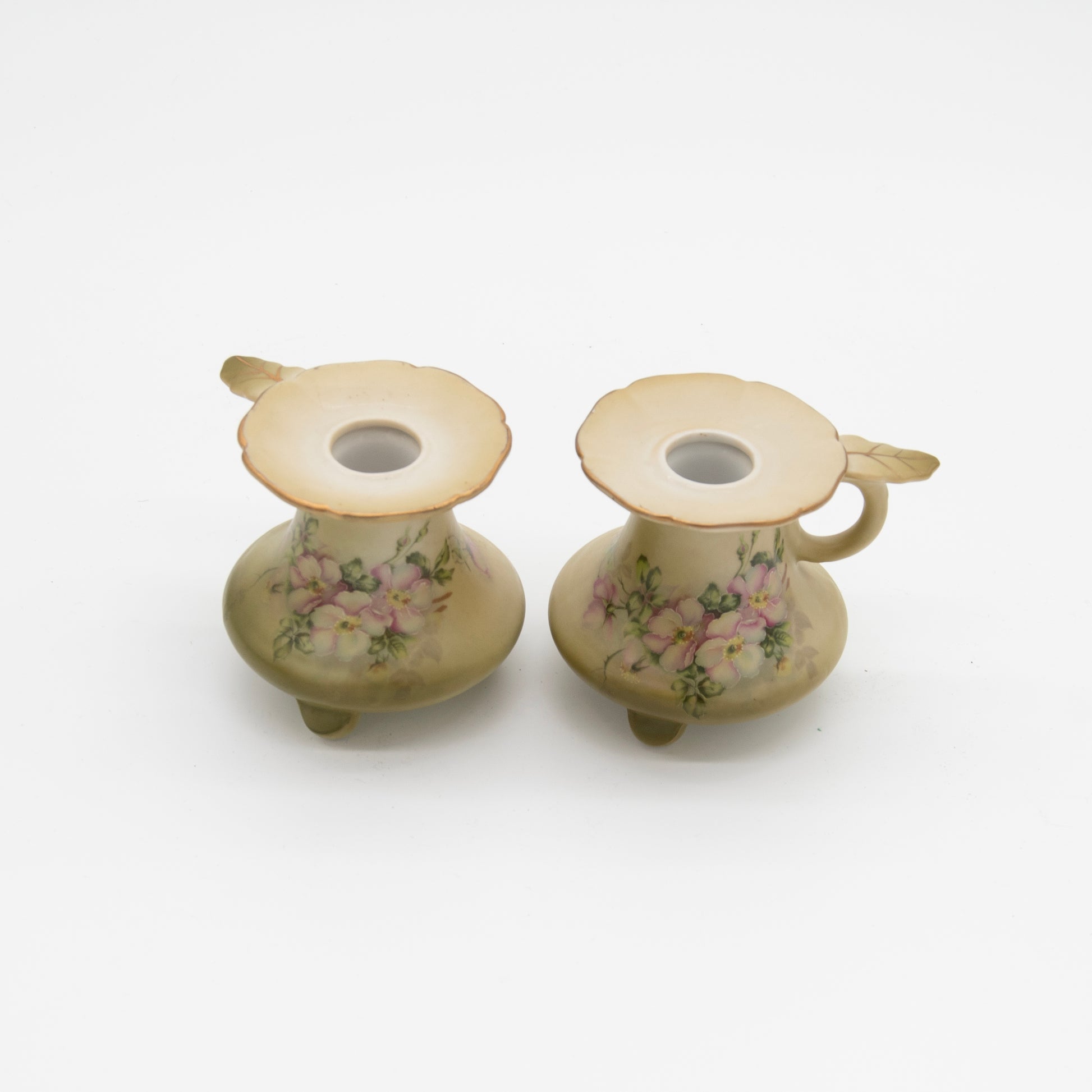Add timeless elegance to your space with this exquisite pair of vintage porcelain candle holder. Featuring a delicate hand-painted floral design, these vintage candle holders showcase soft pastel pink flowers with green foliage, set against a warm cream-toned background. The scalloped rims with gold trim and leaf-shaped handles add an extra touch of Victorian charm.