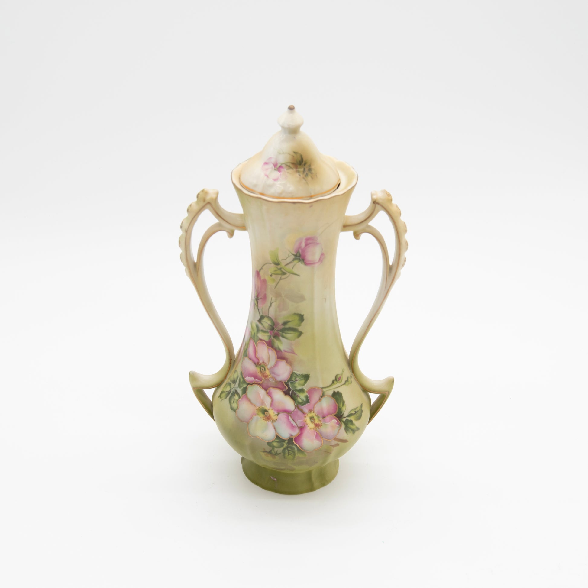 Elevate your home decor with this exquisite vintage hand-painted Nippon vase with lid, featuring a graceful Victorian-era design. This stunning double-handled vase is adorned with delicate pink floral motifs, lush green foliage, and elegant gold accents. The intricate curved handles and ornate finial-topped lid add a touch of old-world charm, making it a perfect statement piece for any vintage, shabby chic, or cottagecore decor.